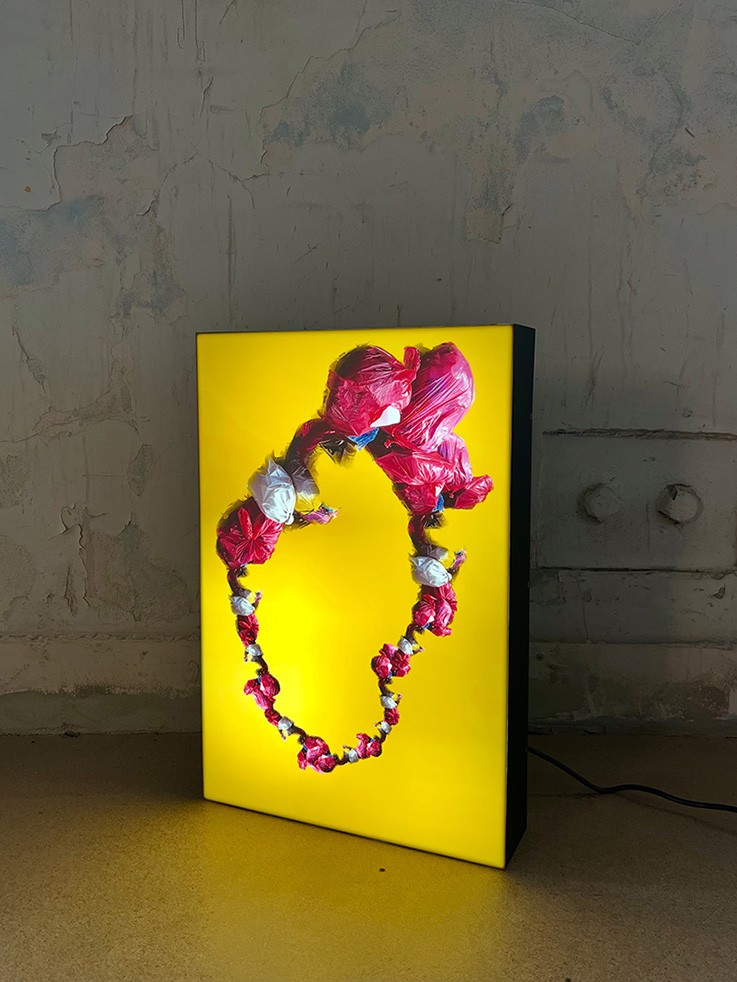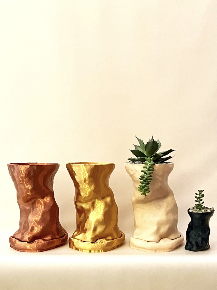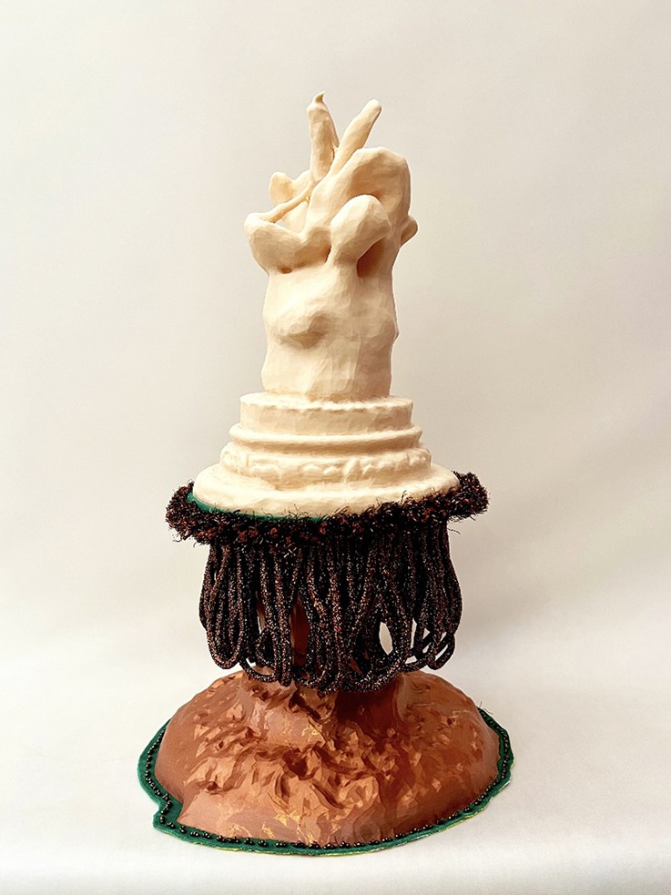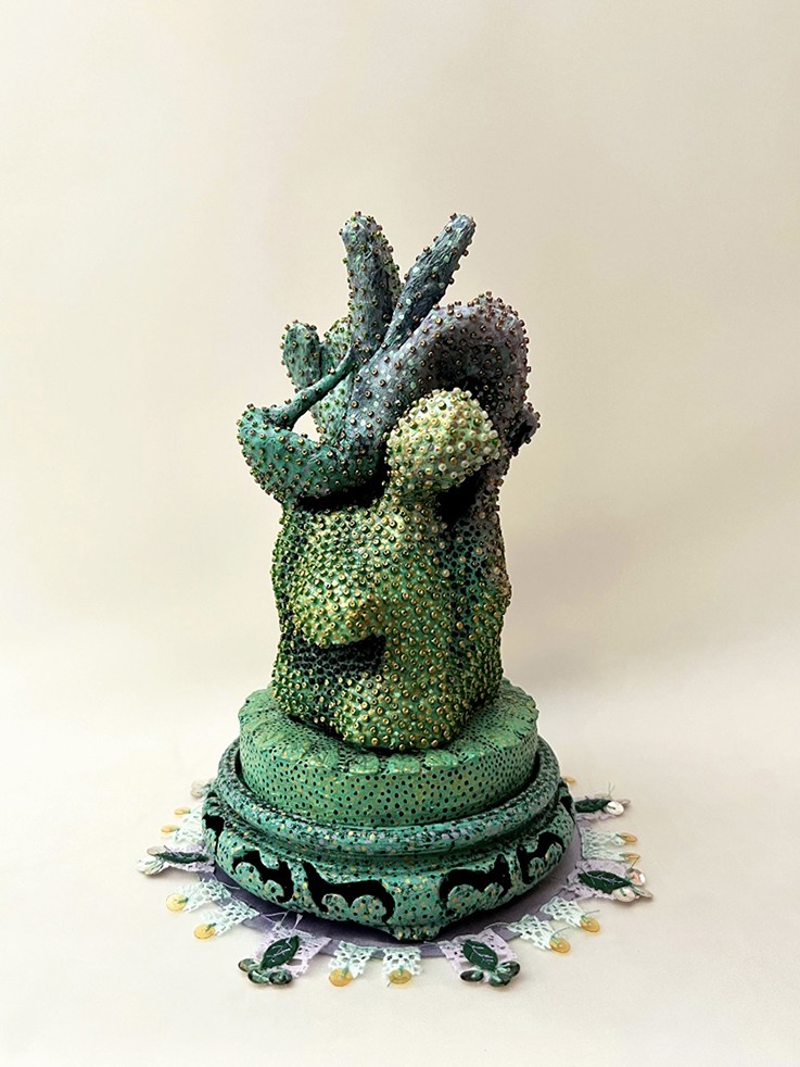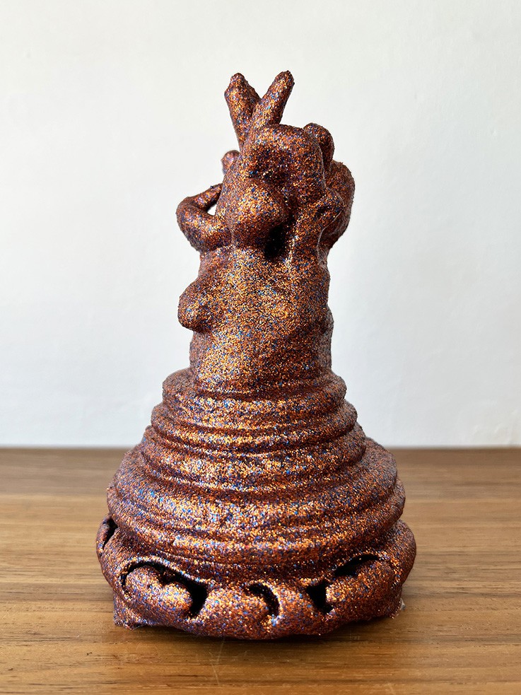 PLA filament, modelling paste, acrylic paint, glue, glitter, wooden base.