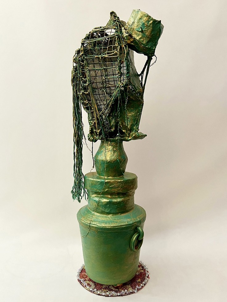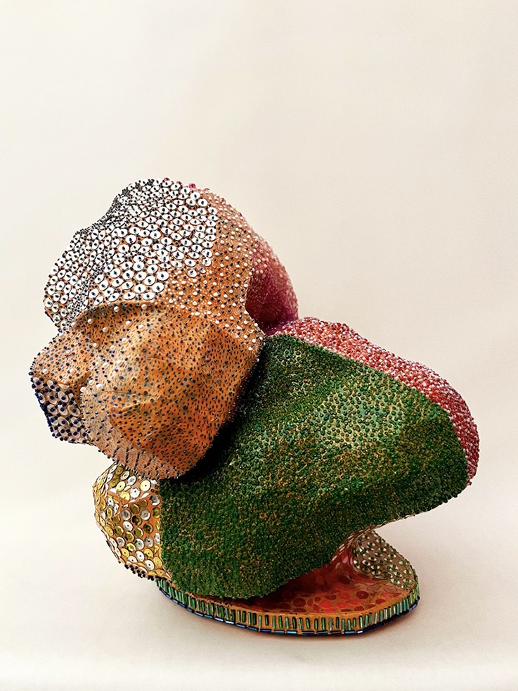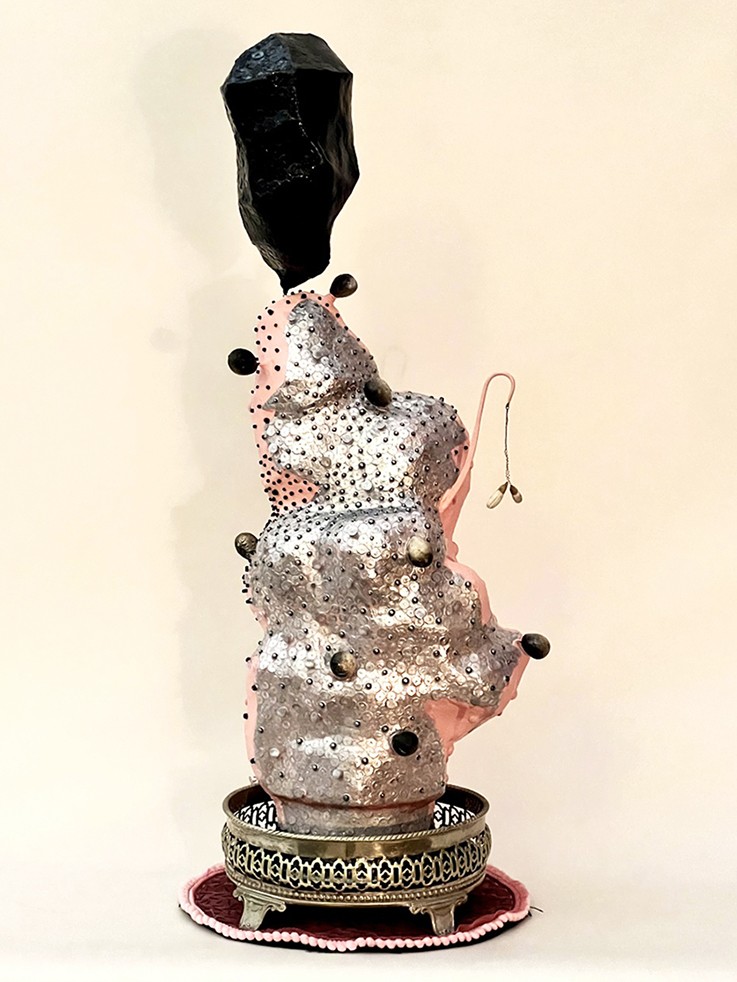 Papier mache, cardboard, staples, sequins, beads, found objects, hand sewn textile mat, varnish, resin, wire.
