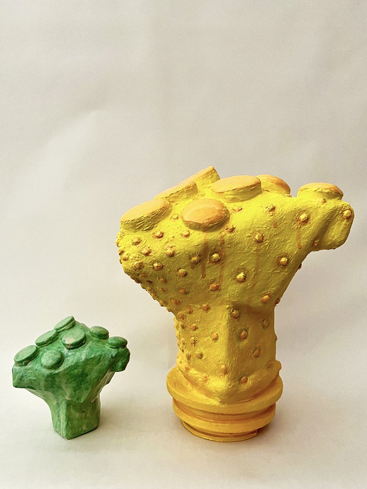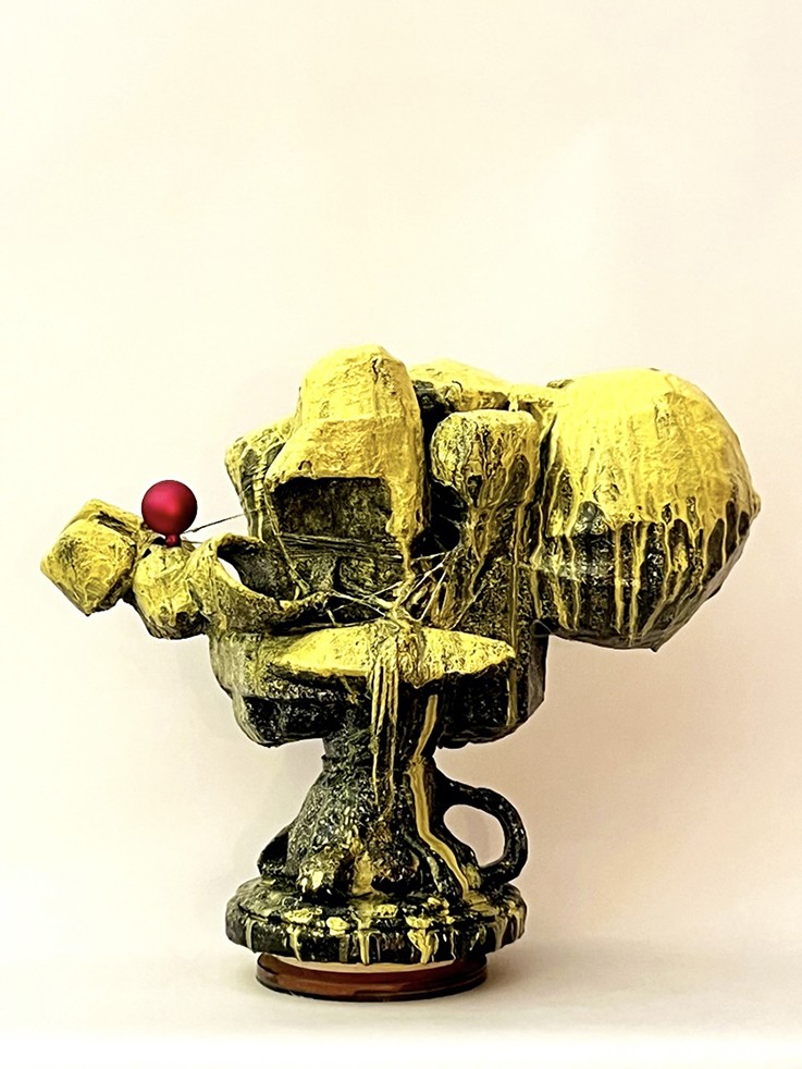 Papier mache, cardboard, staples, found objects, acrylic paint, ink, varnish.