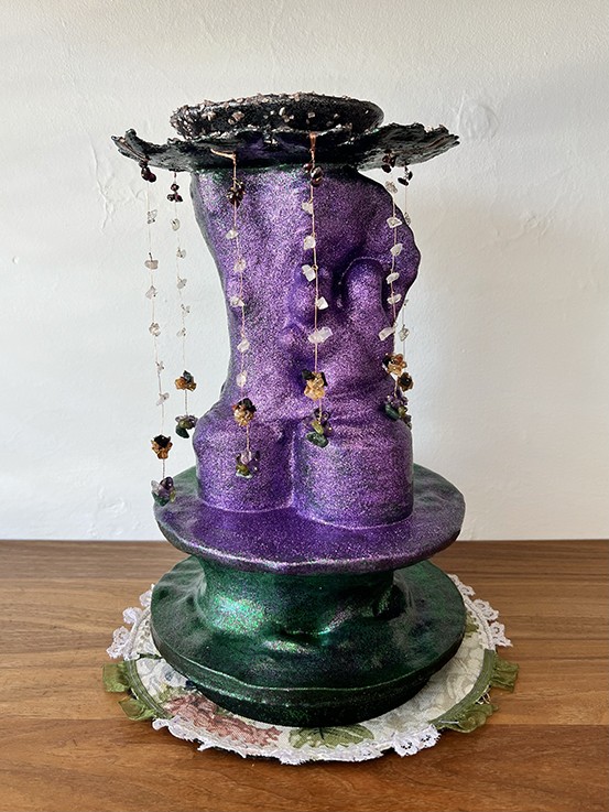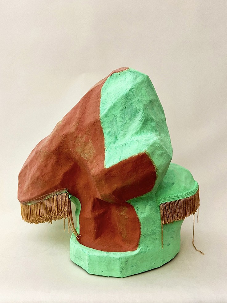 Papier mache, cardboard, staples, beads, found objects, hand sewn textile mat, varnish, resin, wire.